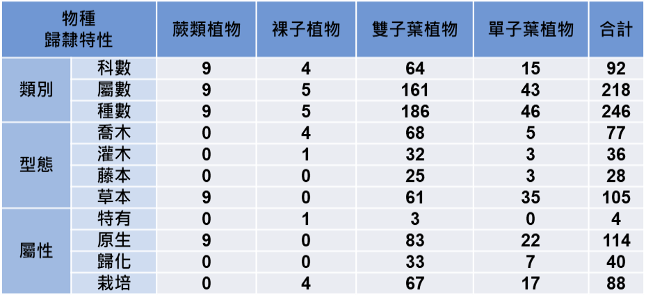 本案維管束植物調查共計發現植物92科218屬246種,其中77種喬木,36種灌木,28種藤本,105種草本,包含4種特有種,111種原生種,40種歸化種,88種栽培種(表1)。