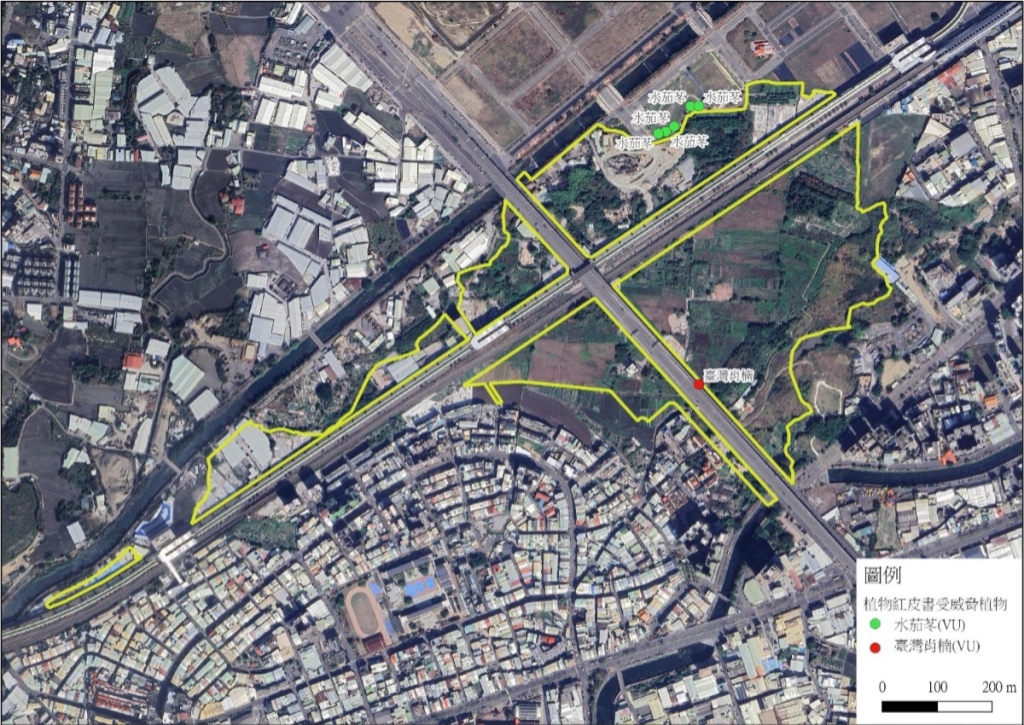 本次調查發現2種台灣維管束植物紅皮書中受威脅植物,分別為臺灣肖楠(VU)、水茄苳(VU),分別為人工栽種於道路及滯洪池旁,均為綠美化用途。
